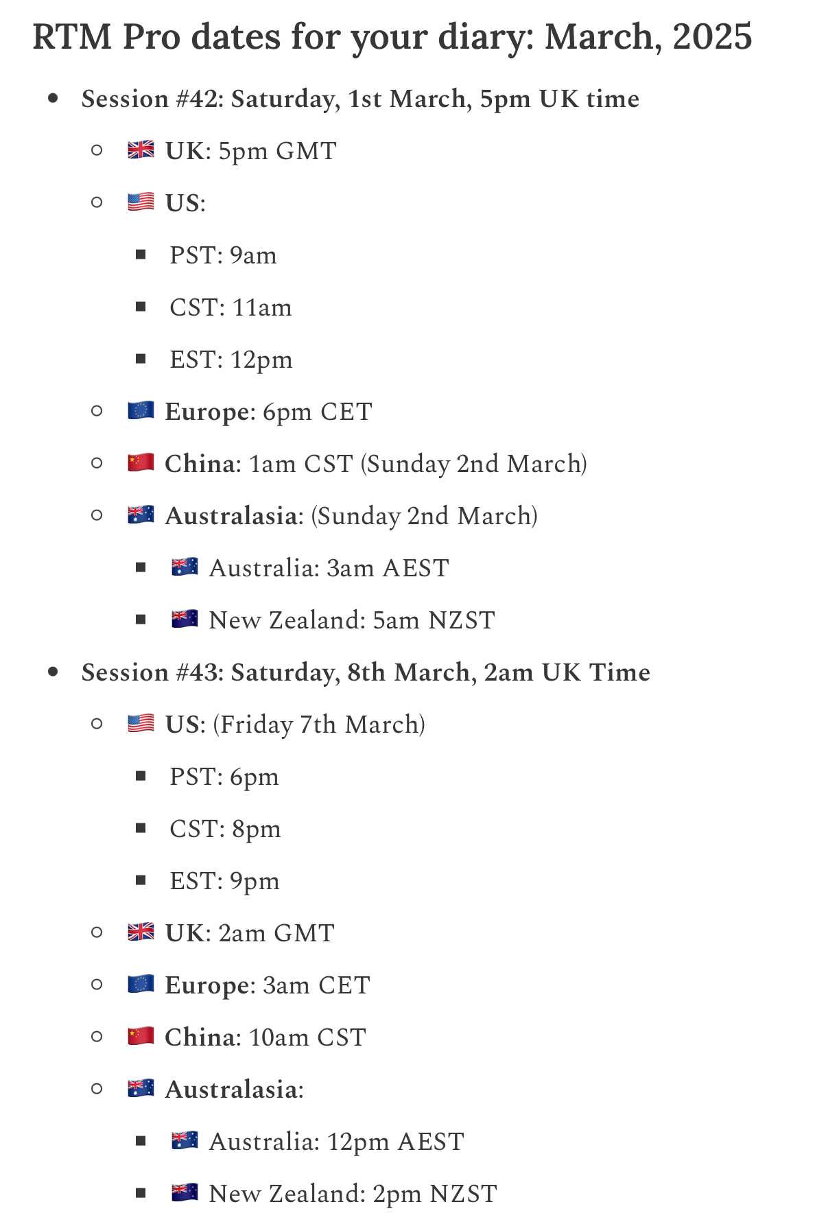 However, we are hoping as more members join this week, we can introduce at least one more timezone, to ensure you get at least three sessions per month, wherever you are.
