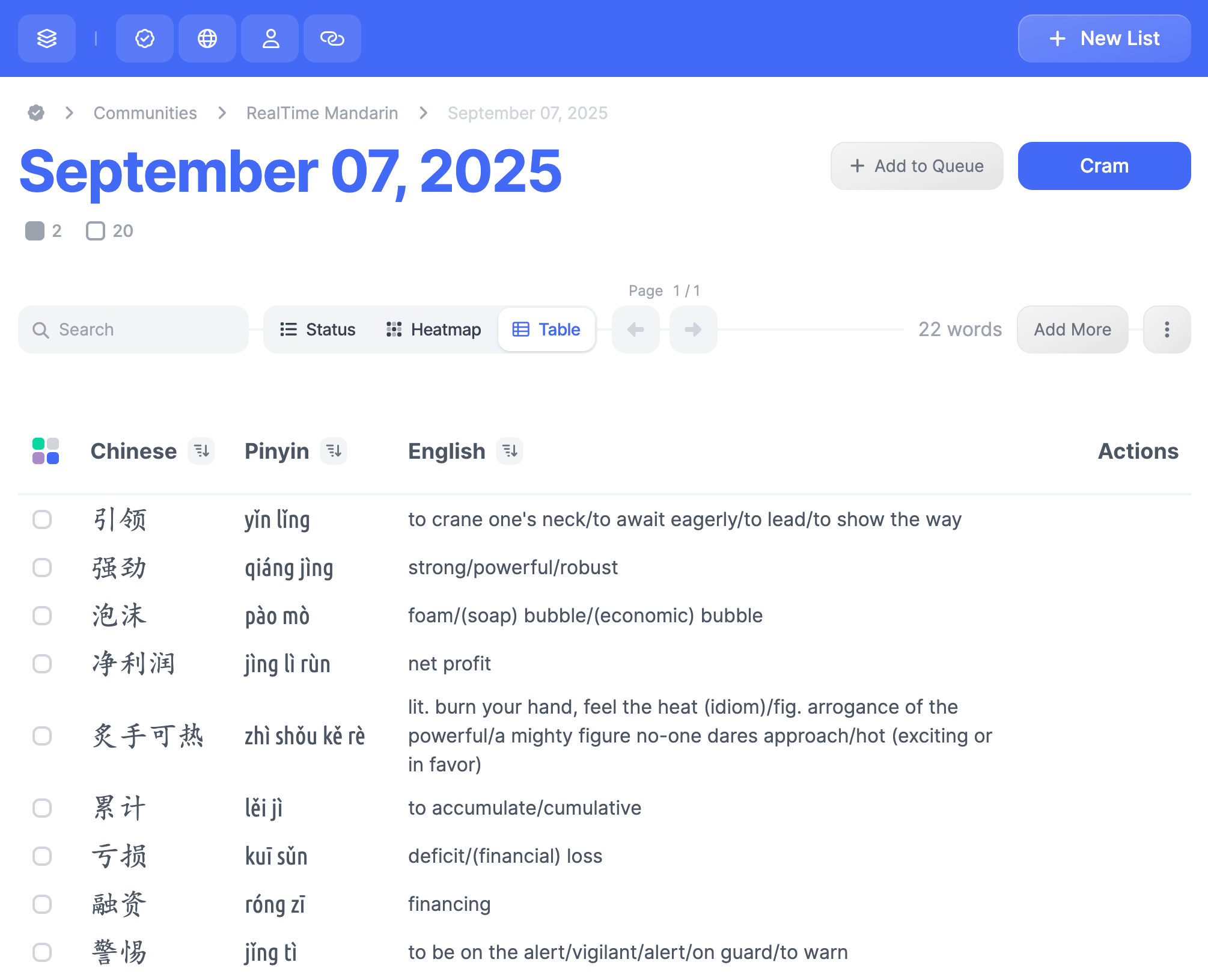 Seamless RealTime Mandarin integration: every weekly word list is ready to add to your study queue, so nothing you learn slips away